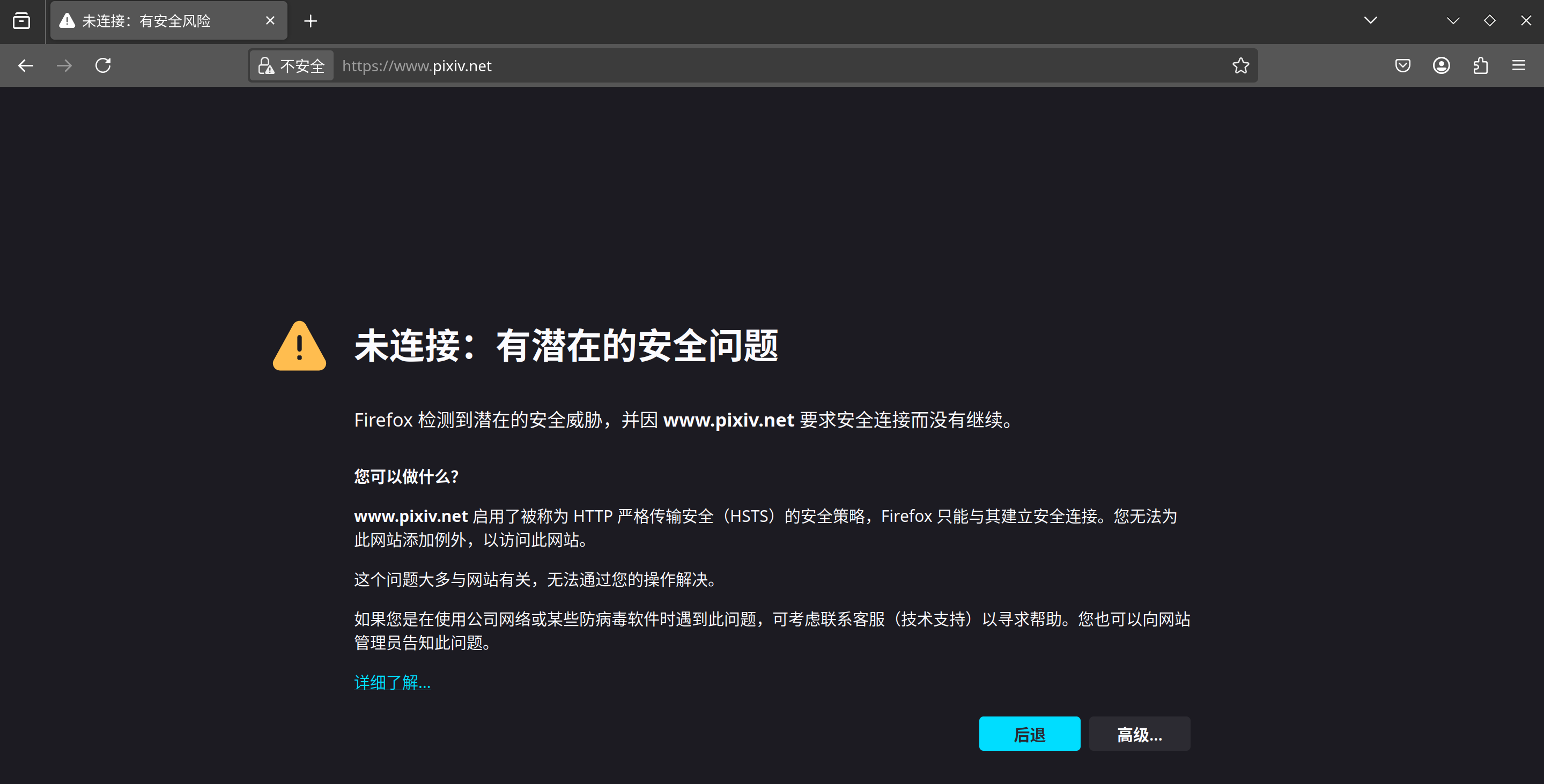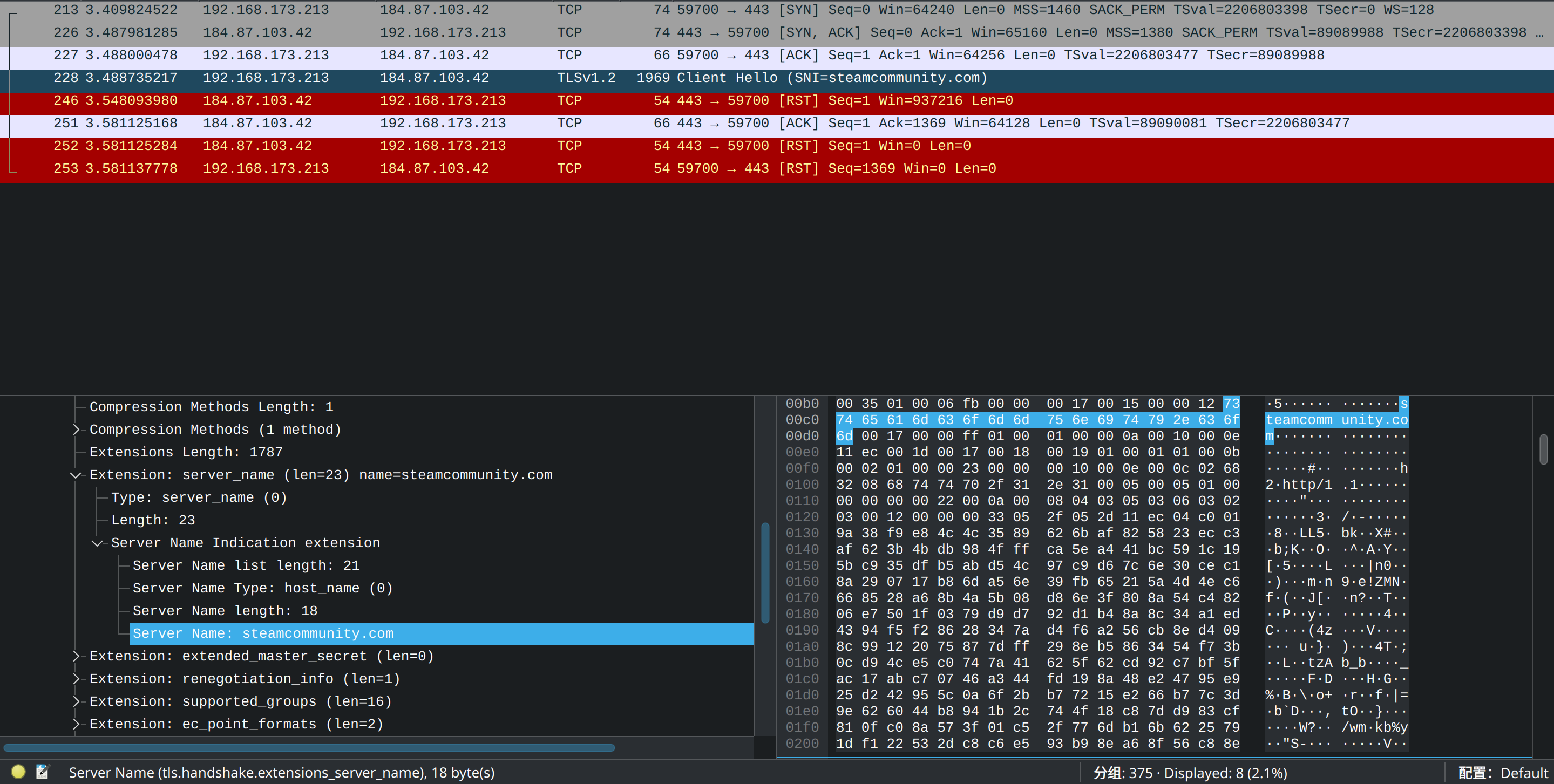 可以发现,首先我们顺利完成了TCP三次握手的流程,开始了TLS握手。在发送了包含steamcommunity.comSNI的Client Hello数据包(深蓝色)后,立刻就收到了来自GFW的RST数据包(红色),连接终止,网页显示“连接已重置”。