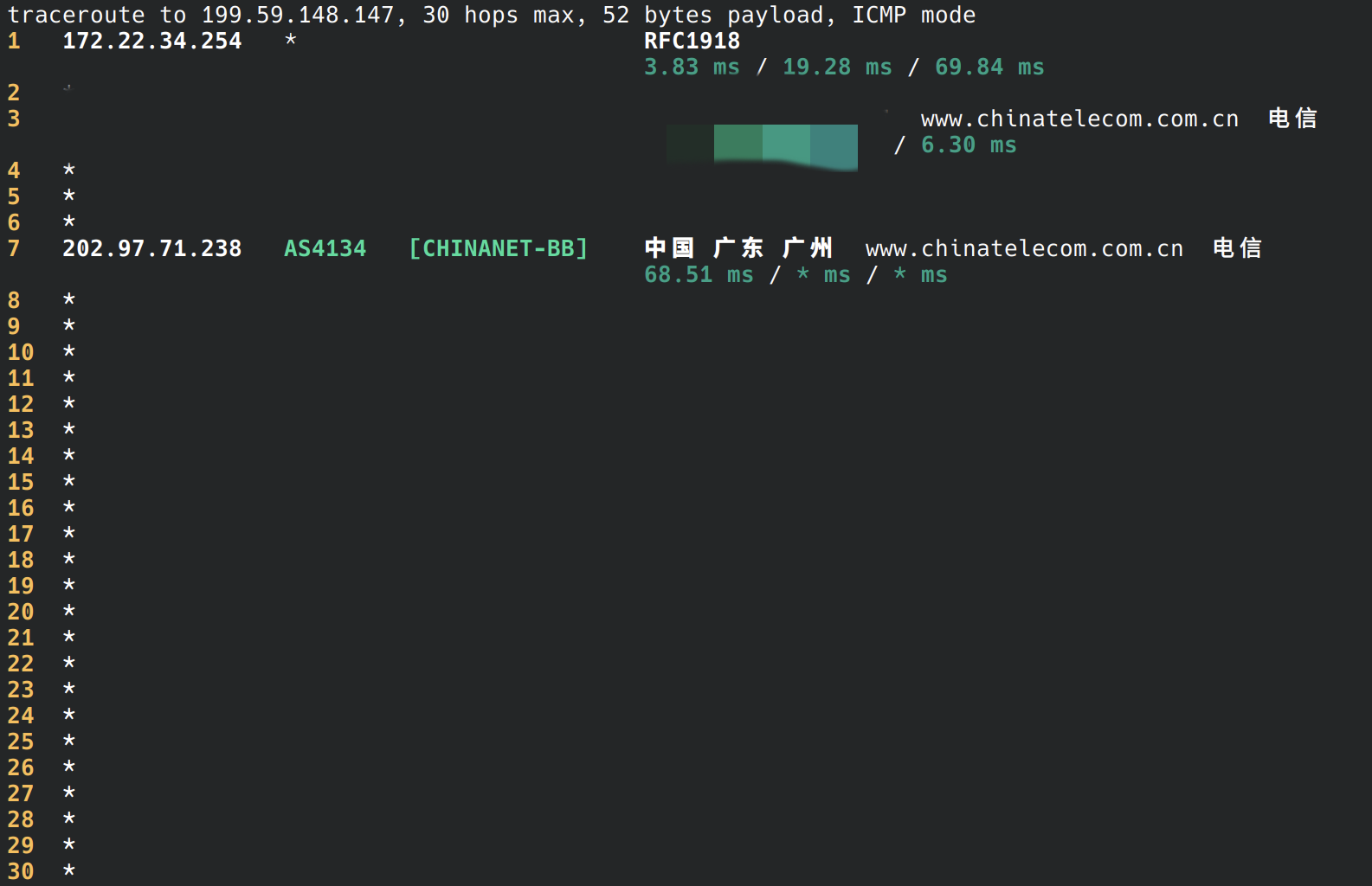 接下来客户端开始TCP握手,向这个错误的IP发送包含SYN的报文以建立连接,不过我们并没有看到来自服务器的ACK确认报文。使用Traceroute工具可知,我们对这个IP发送的数据包在跨境段被丢弃了,因此服务器(无论是真是假)永远都不可能收到我们的连接请求
