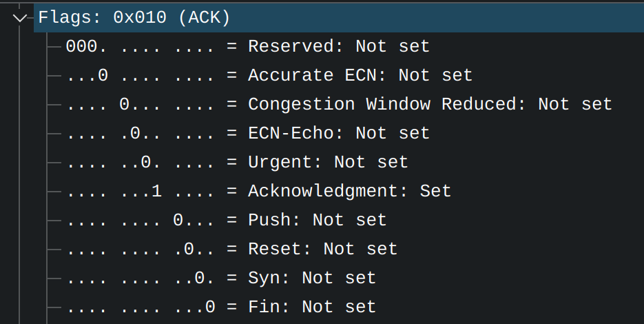 其中SYN和ACK(也就是图中的Acknowledgement)在TCP握手中使用,这张图中的ACK位设置为1,说明这是TCP的第三次握手,连接已经建立,可以开始发送数据了。