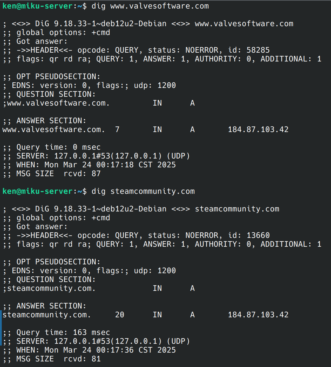可以看到,这里DNS首先返回了steamcommunity.com的地址,是199.59.148.147,查询可知,这个IP地址归属于Twitter,很明显不是V社的IP,这说明我们遭到了DNS污染