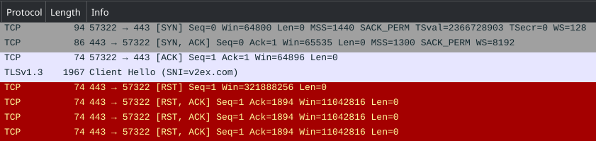 我们使用QUIC协议访问位于防火墙黑名单中的网站v2ex.com,并抓包分析结果,首先使用传统TCP协议: