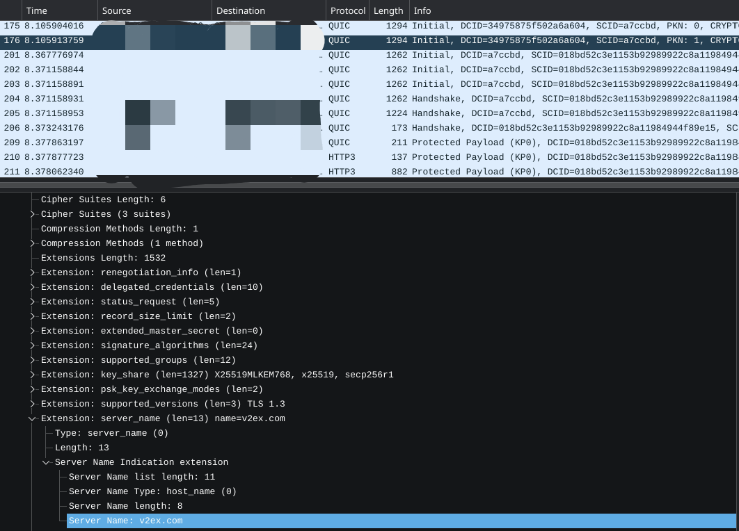 在使用ECH的情况下,抓包看看访问v2ex.com的结果: