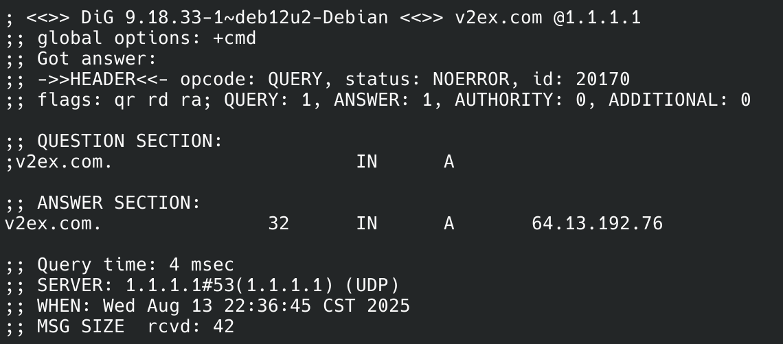 使用Cloudflare提供的公共DNS举例,作为对比,如果同城有阿里云的机房,那么阿里云DNS的查询时间一般在10ms左右,而广州-香港IEPL端内的时延一般在6ms左右。如此短的查询耗时说明除非用的是比光更快的传输介质,不然一定是被防火墙劫持了(